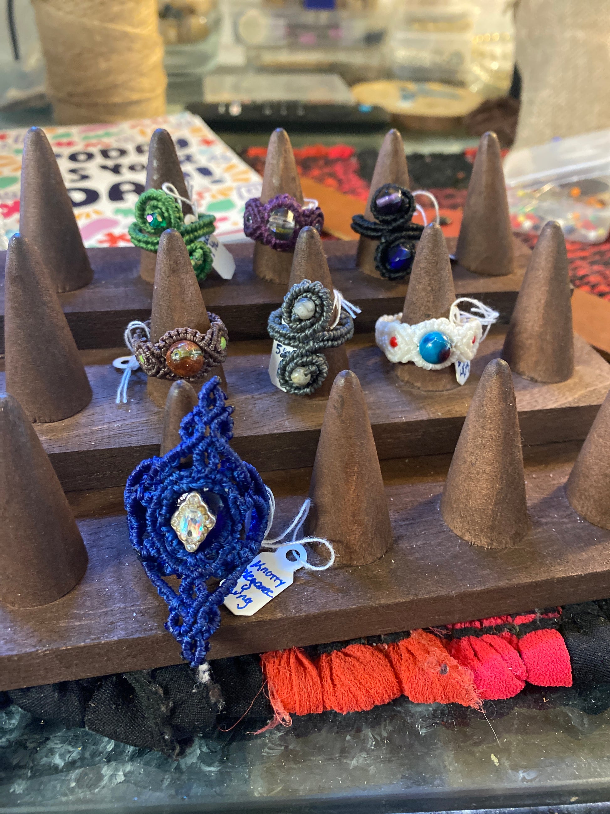 These beautiful fiber wrapped macramé rings come in various colors with different metal, stone, crystal or glass beading and knotted with hemp or poly in various sizes.