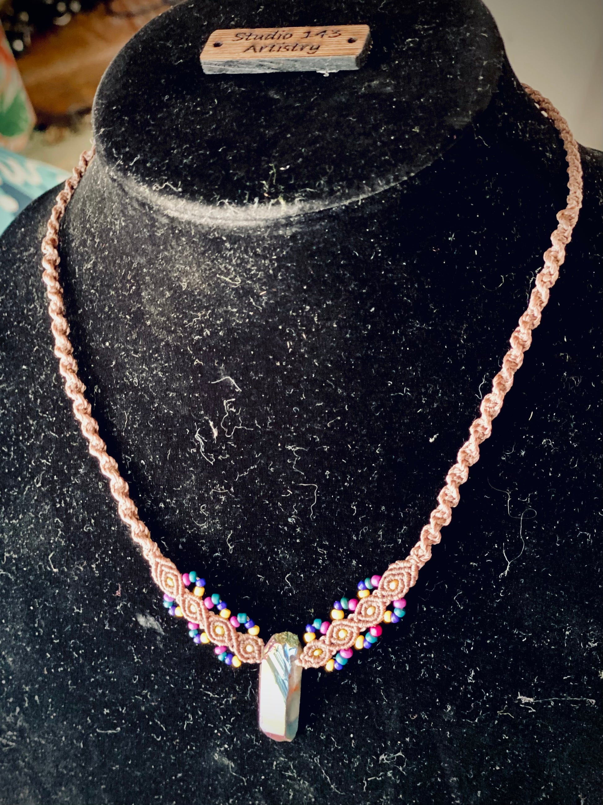 Rainbow Crystal Quartz Necklace with Glass Beaded Accents in Mink Brown