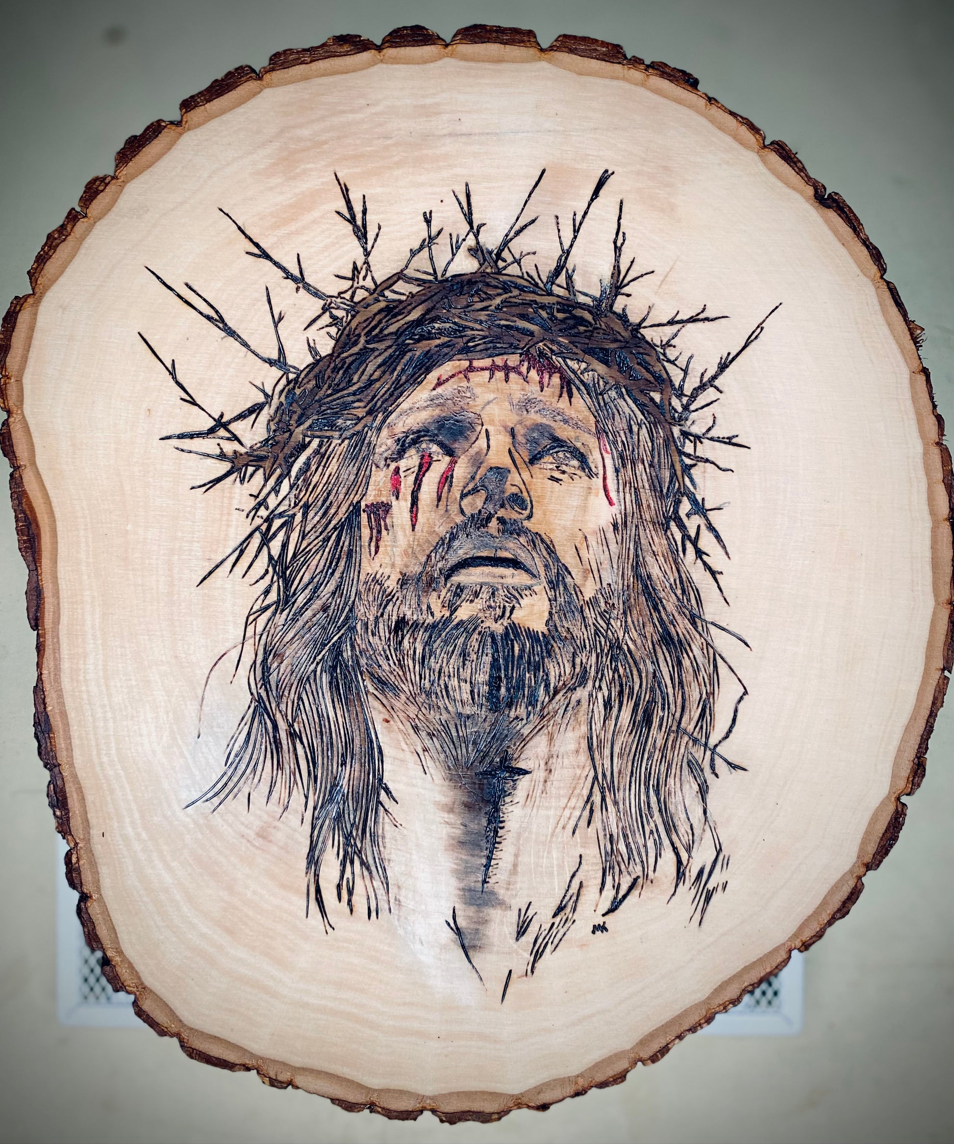 Beautifully burned hand, drawn, depiction of Jesus, wearing a crown of thorns praying with God.